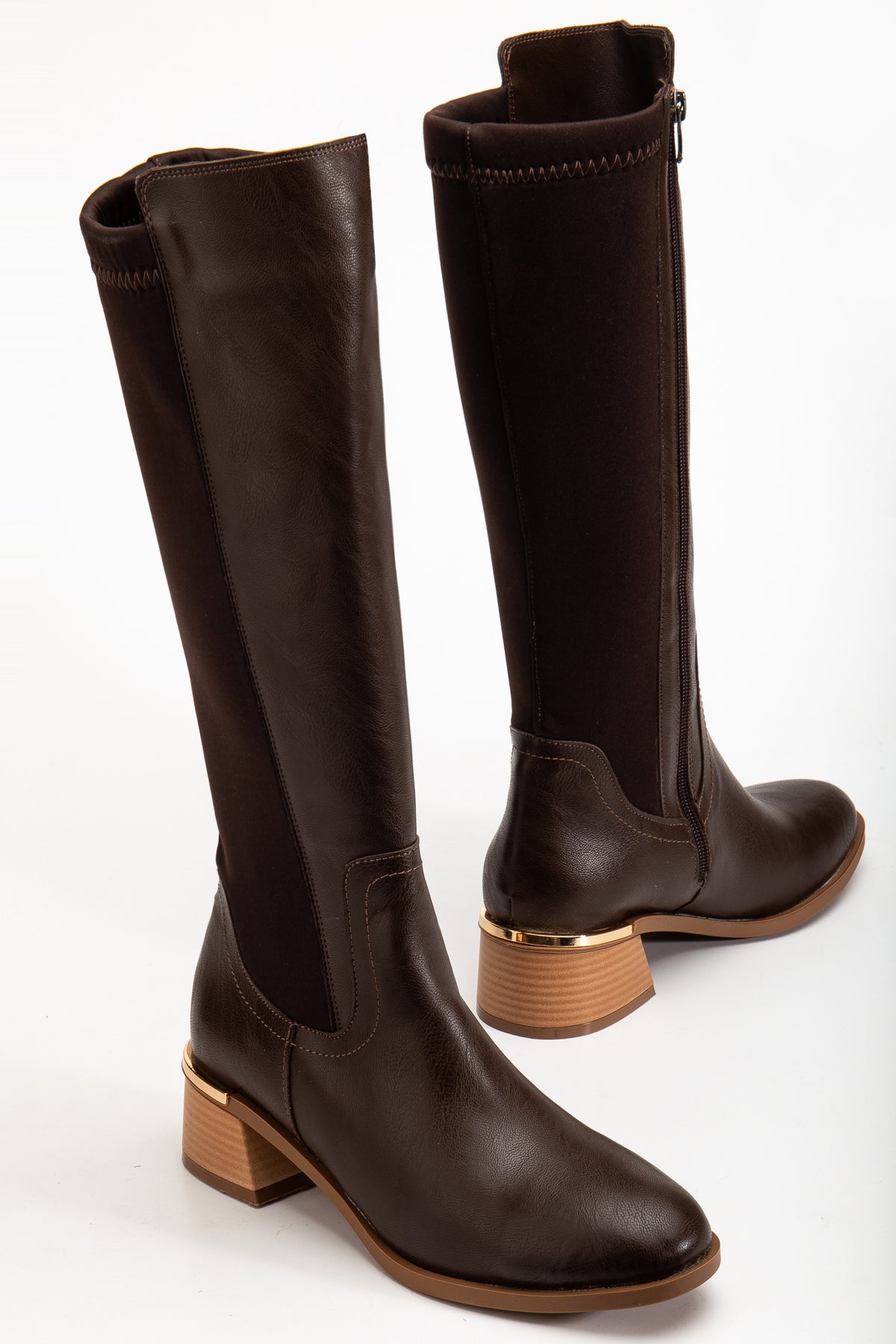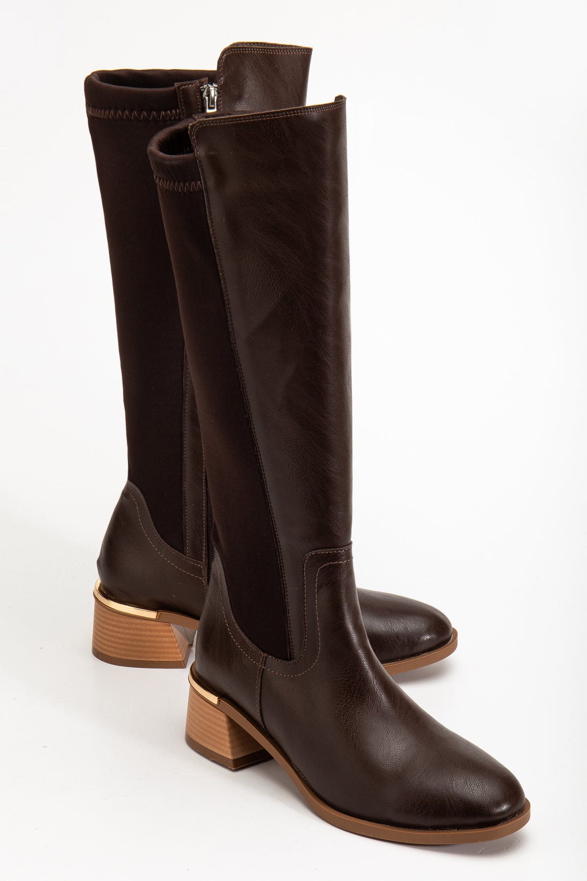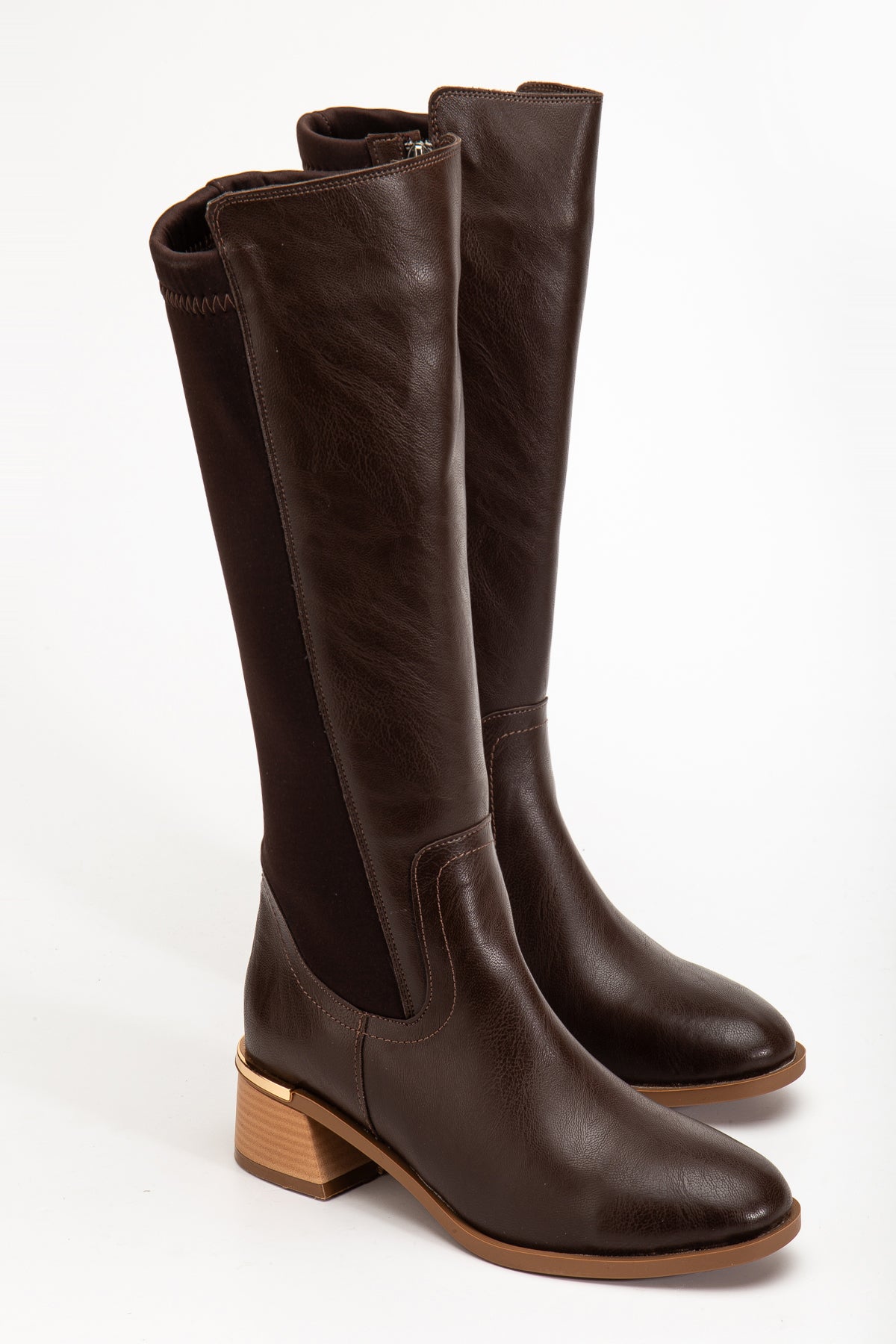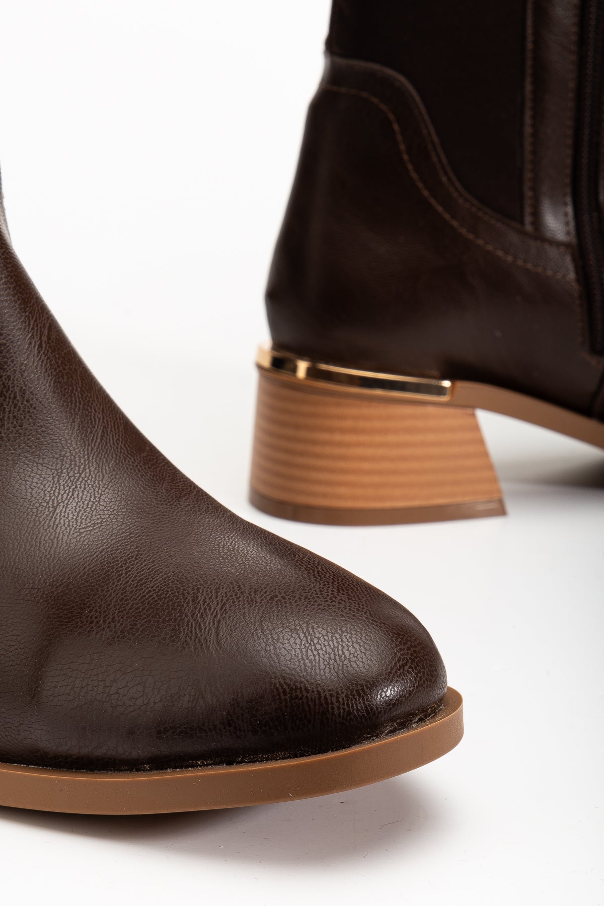 Kadın Diz Altı Fermuarlı Streç Lastikli Günlük Çizme Nora Kahve Cilt