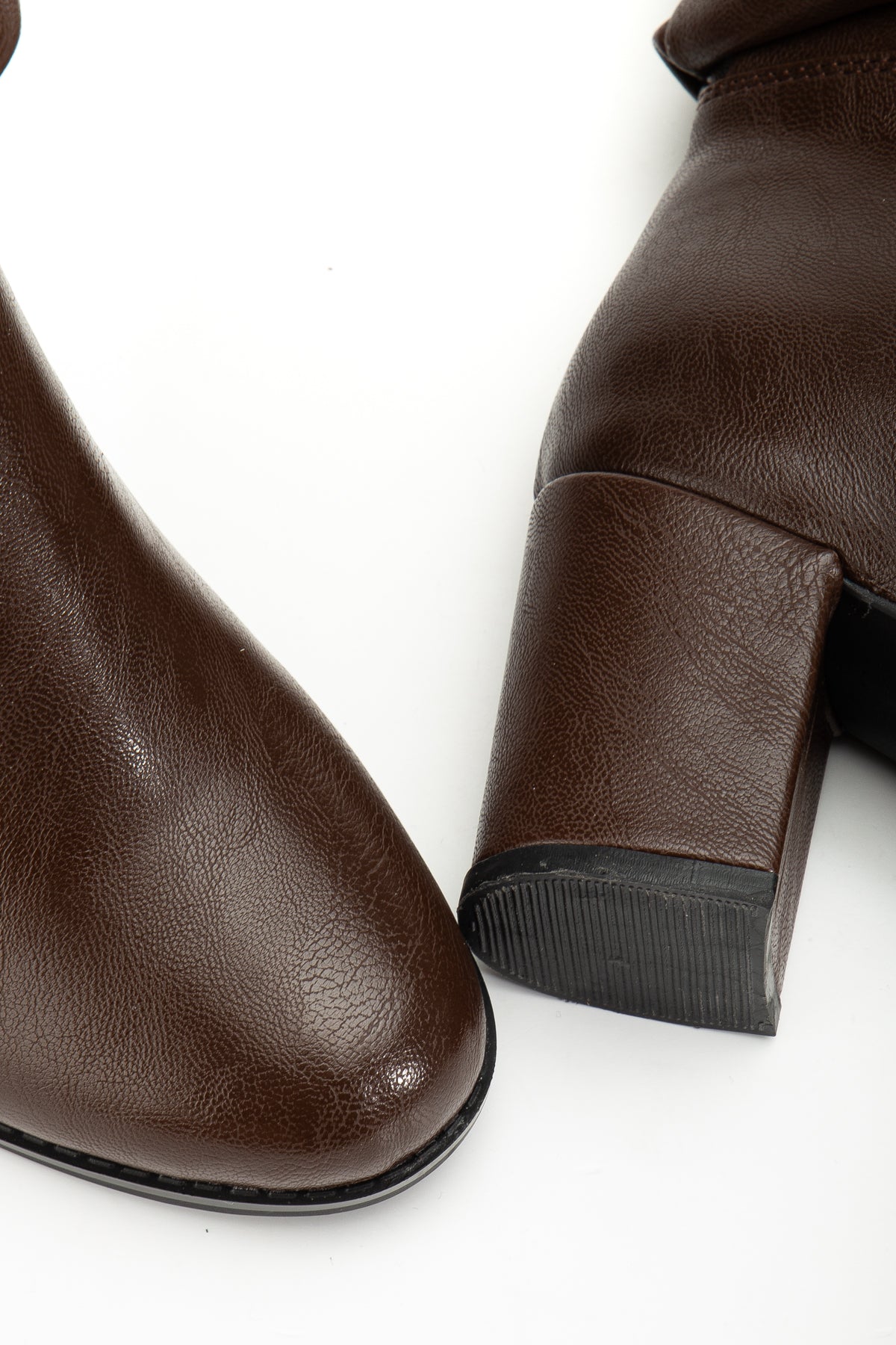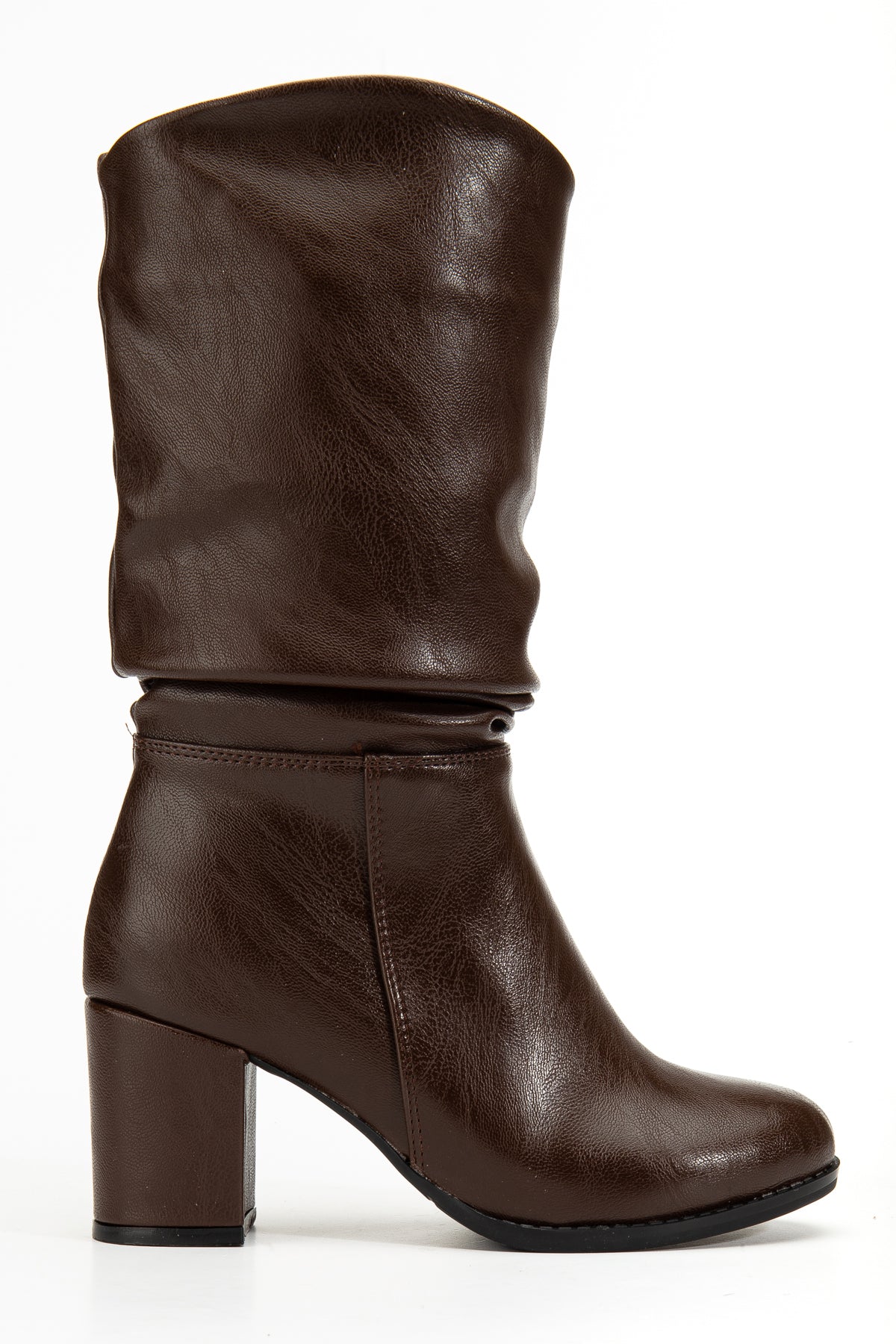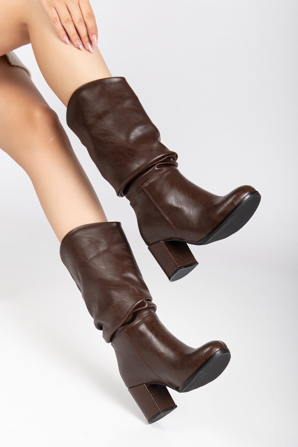 Kadın Kalın Topuk Yuvarlak Burun Büzgülü Diz Altı Çizme Tina Kahve Cilt