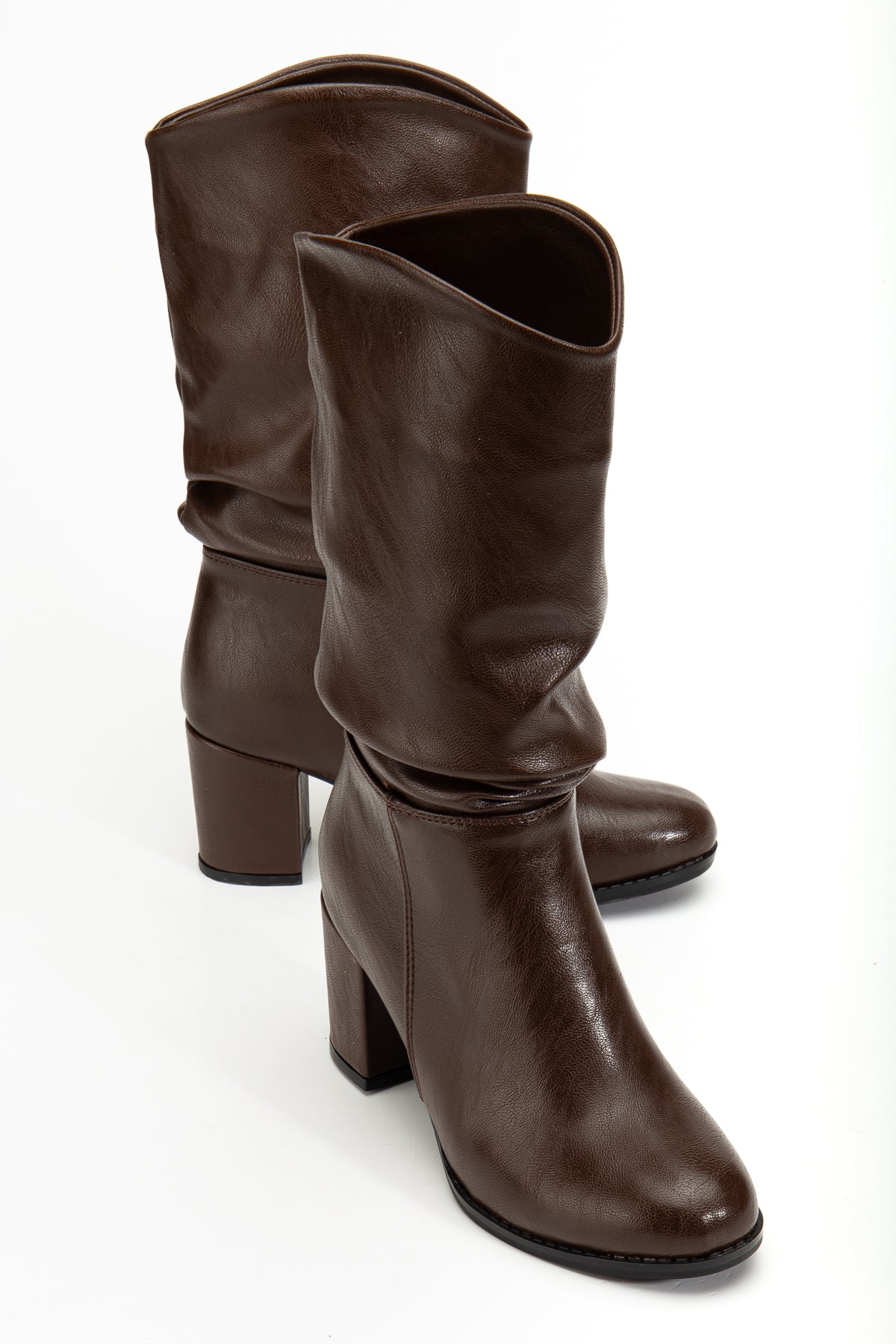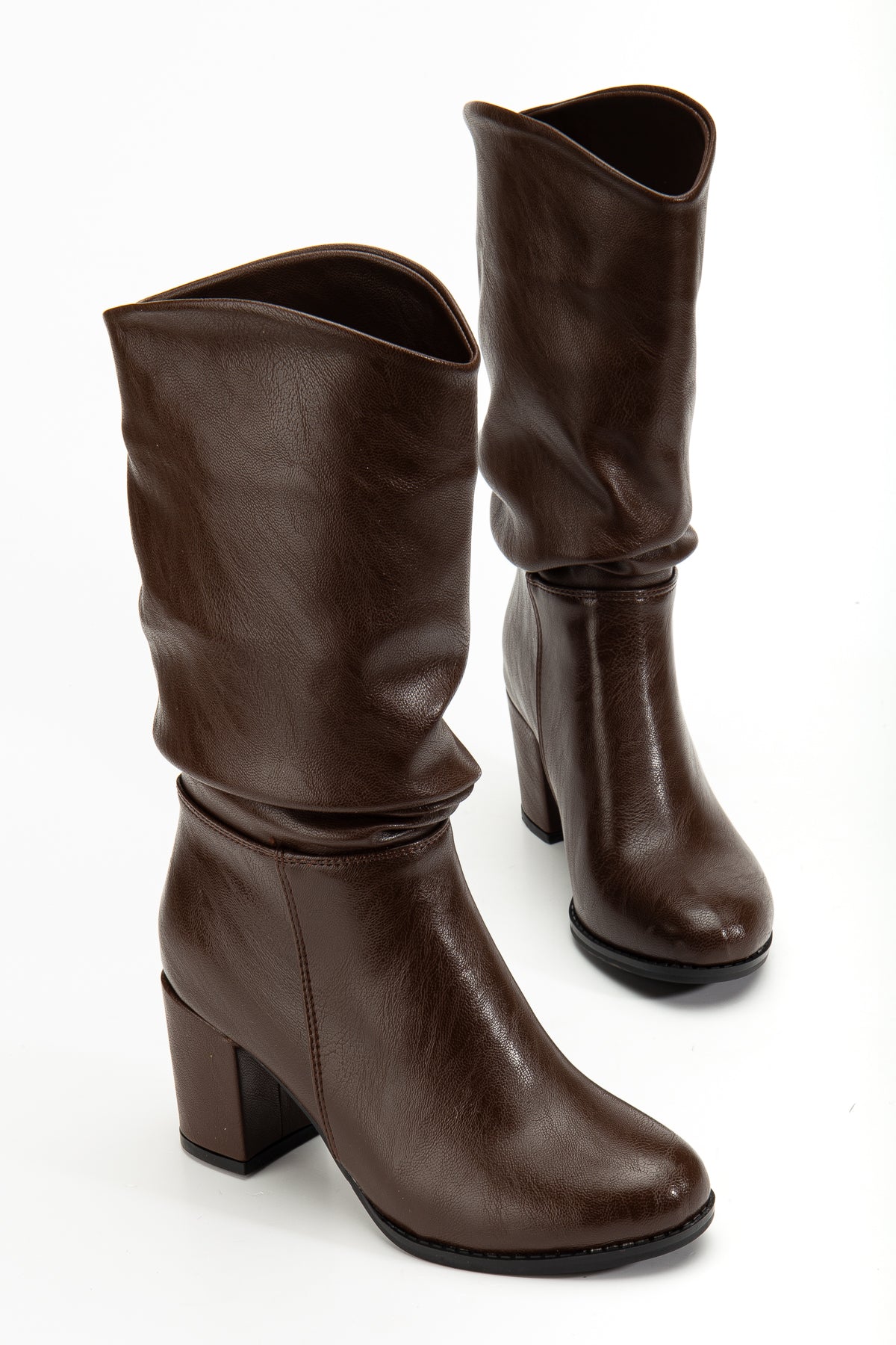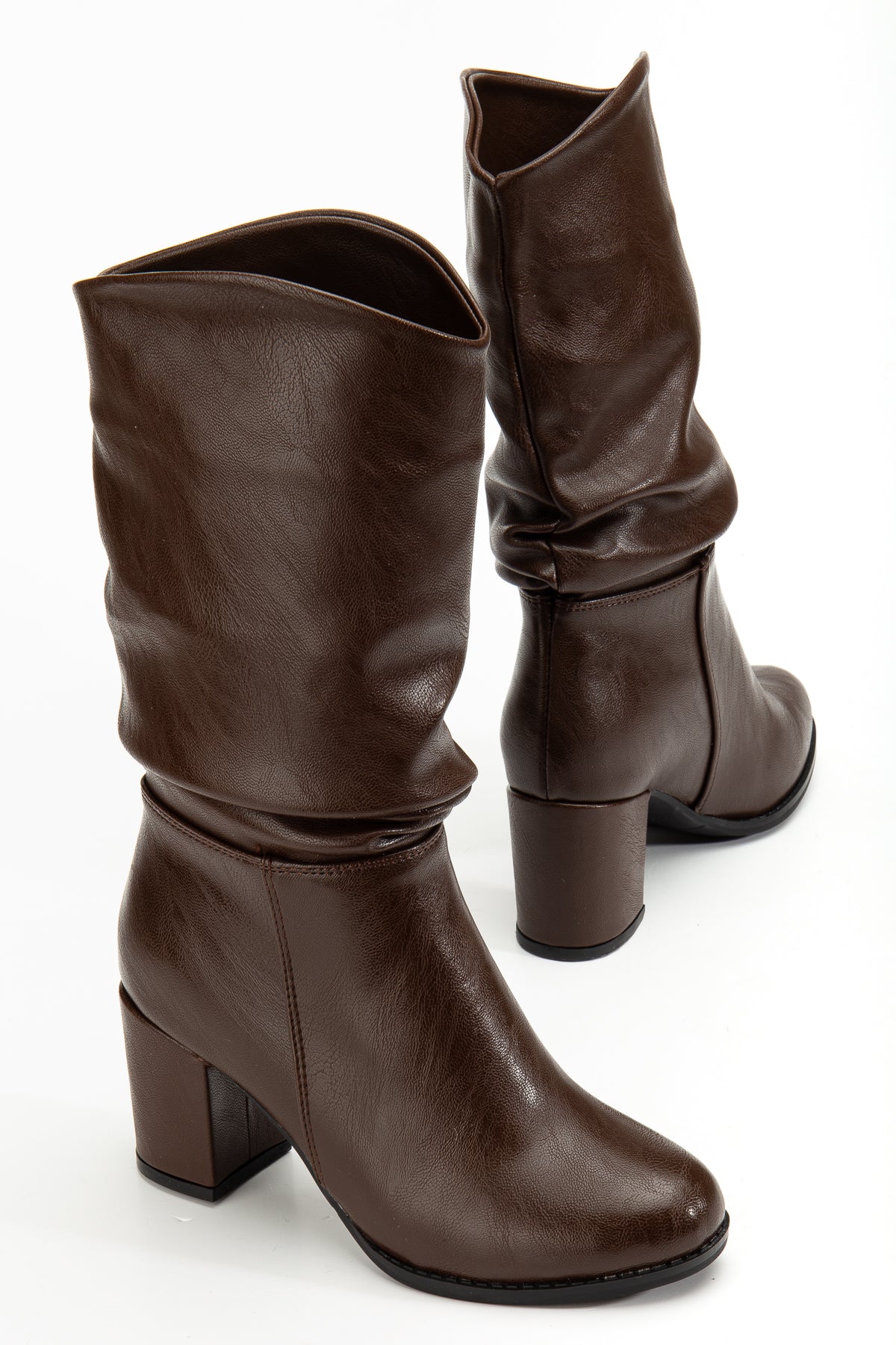 Kadın Kalın Topuk Yuvarlak Burun Büzgülü Diz Altı Çizme Tina Kahve Cilt