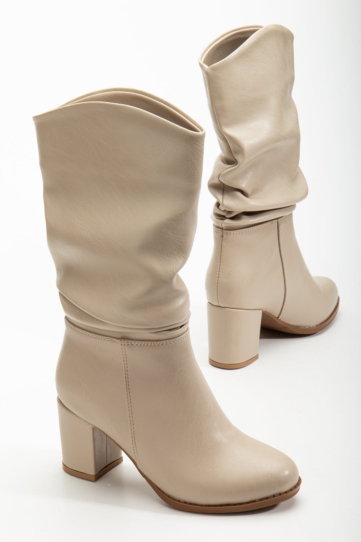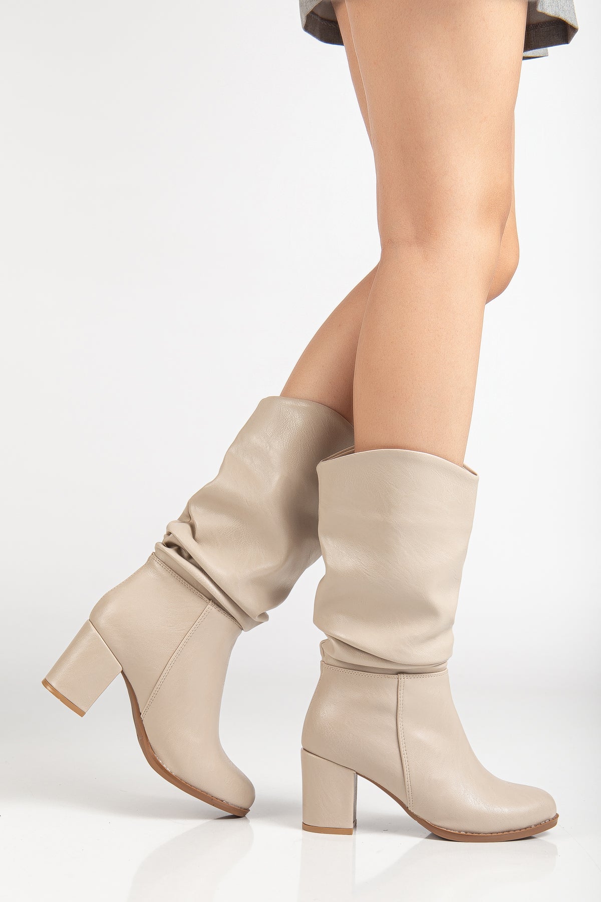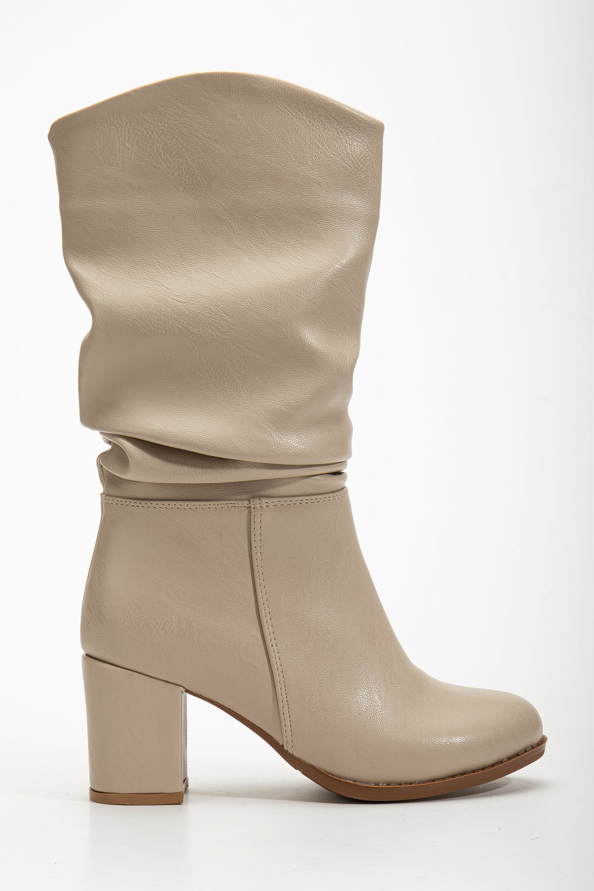 Kadın Kalın Topuk Yuvarlak Burun Büzgülü Diz Altı Çizme Tina