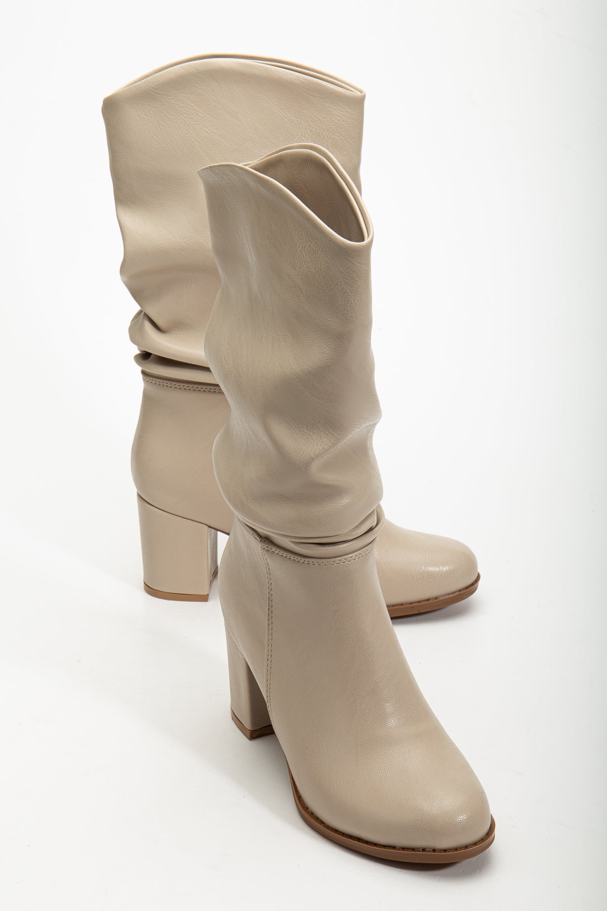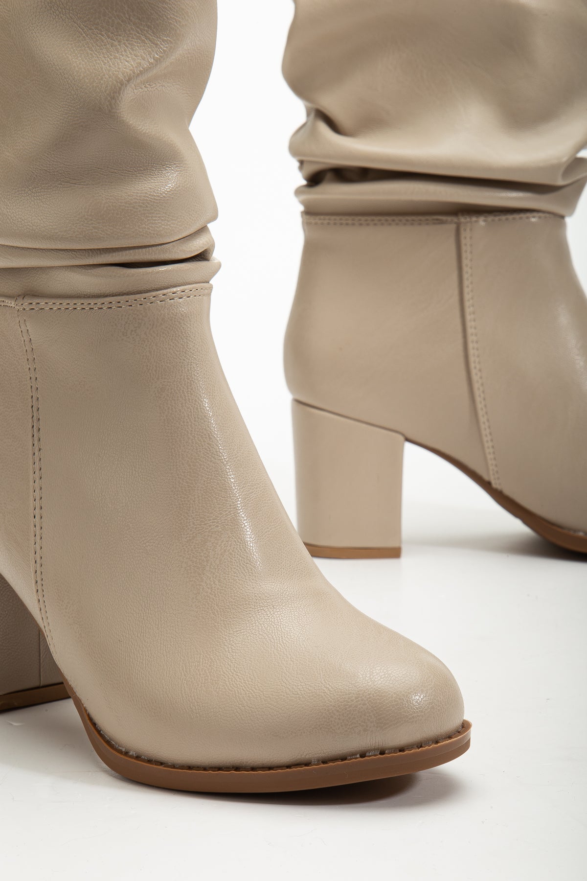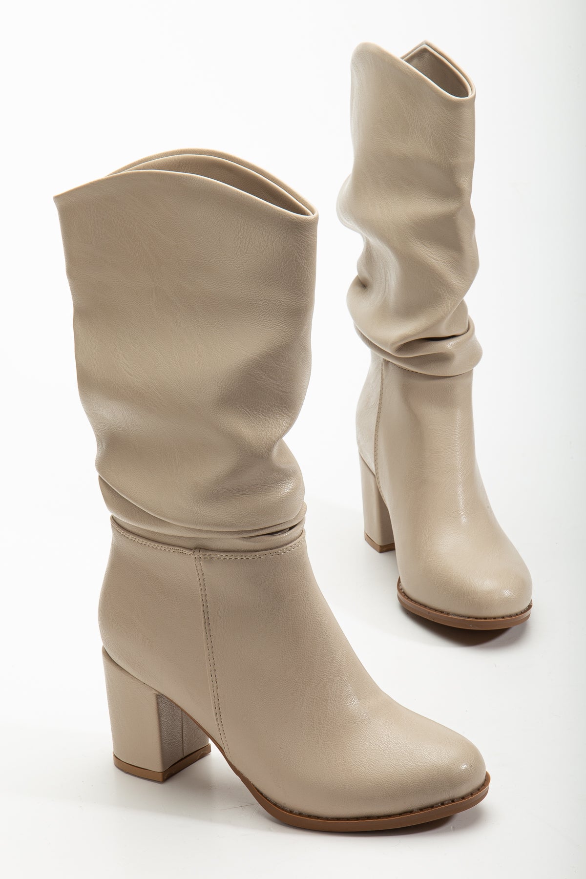 Kadın Kalın Topuk Yuvarlak Burun Büzgülü Diz Altı Çizme Tina