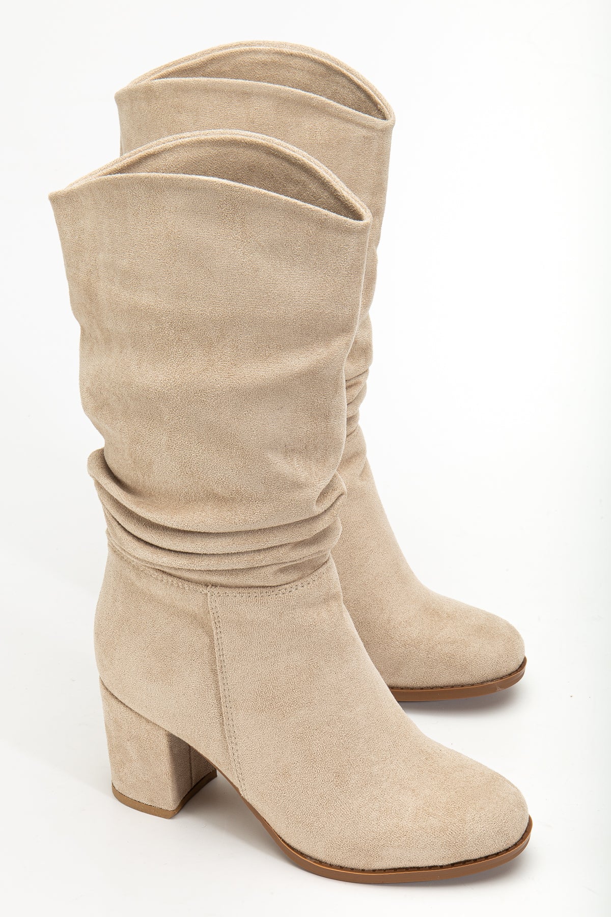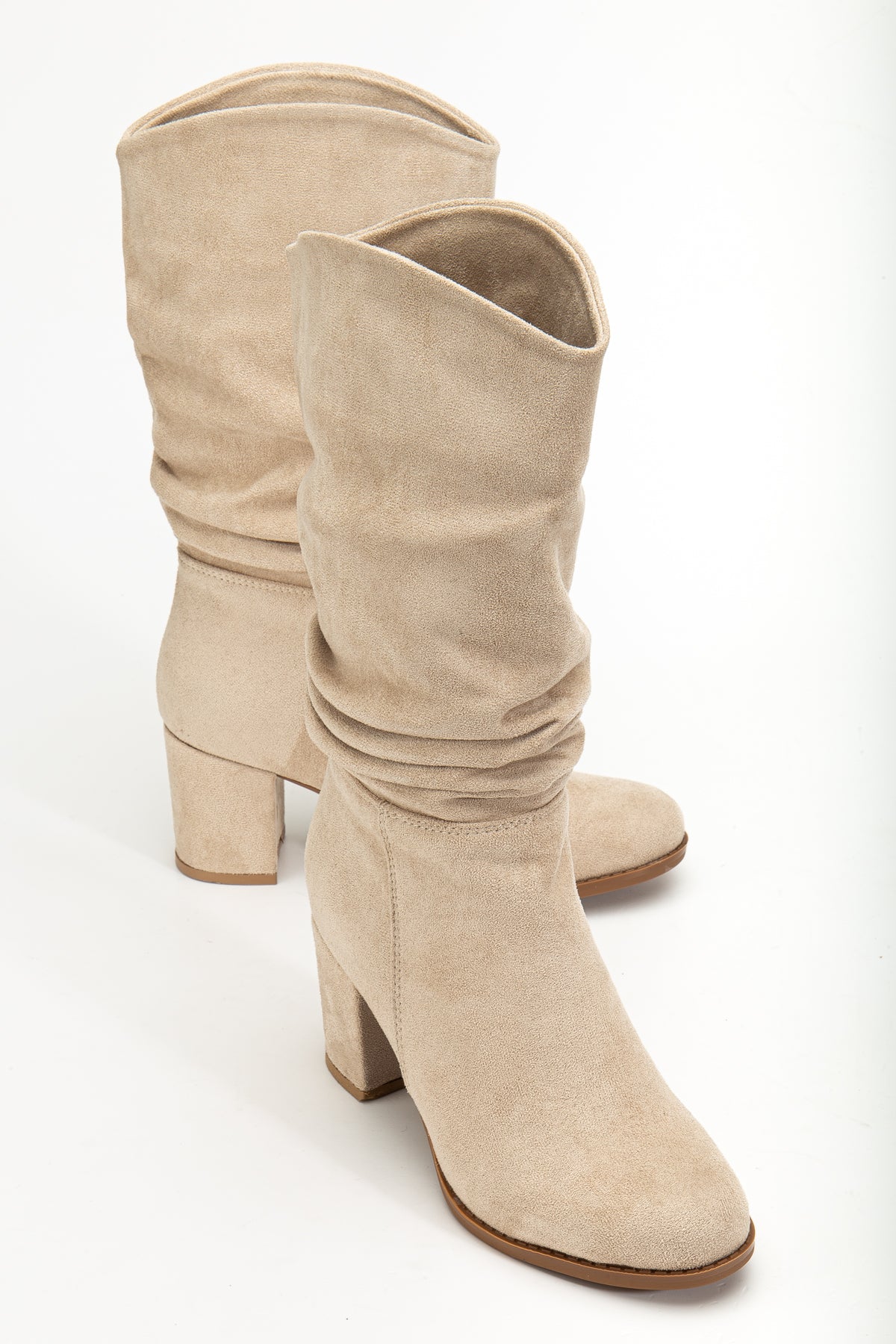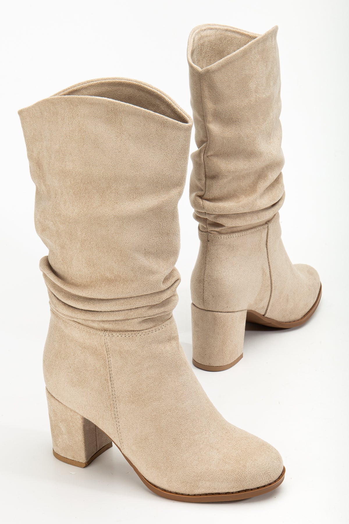 Kadın Kalın Topuk Yuvarlak Burun Büzgülü Diz Altı Çizme Tina Siyah Bej Süet