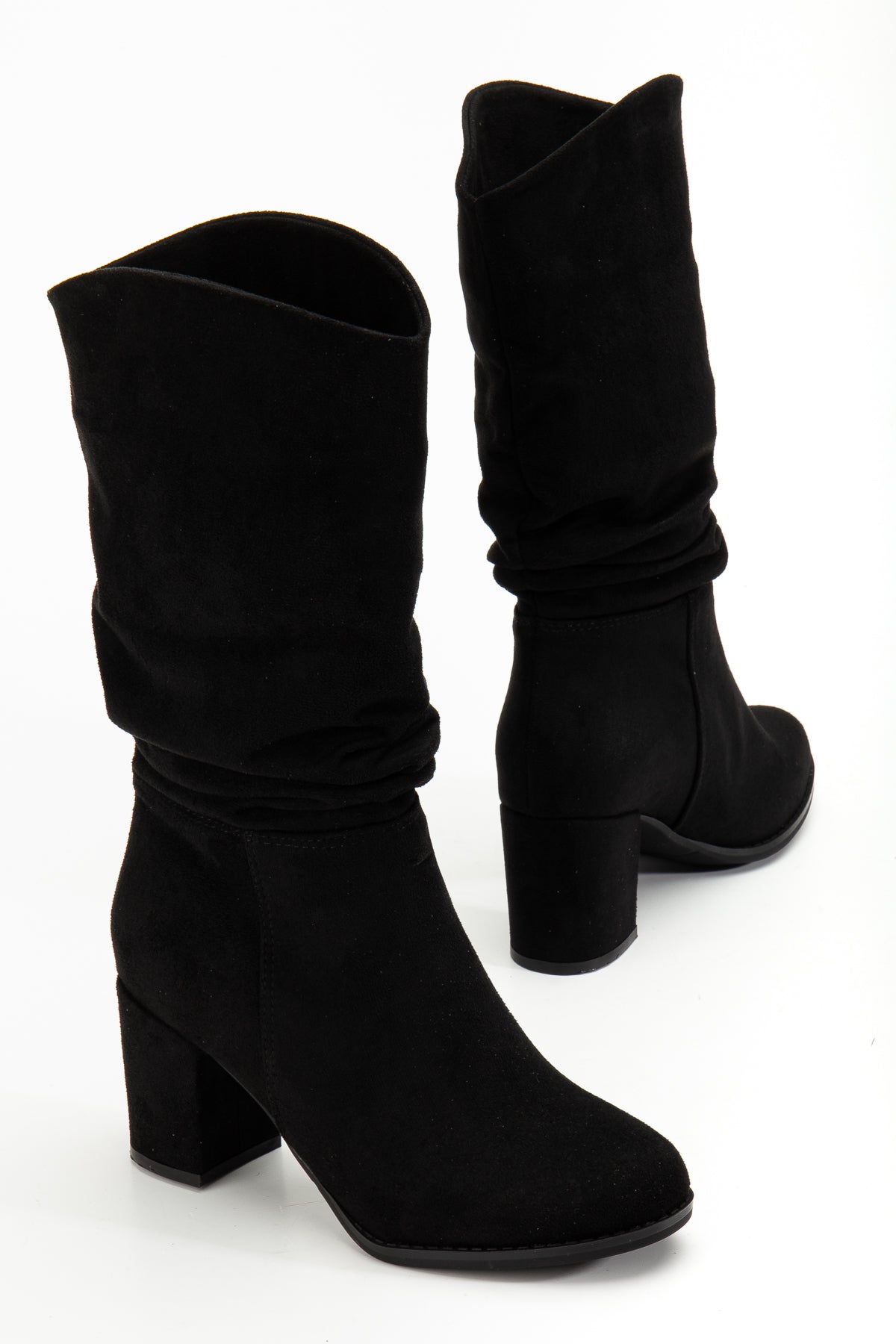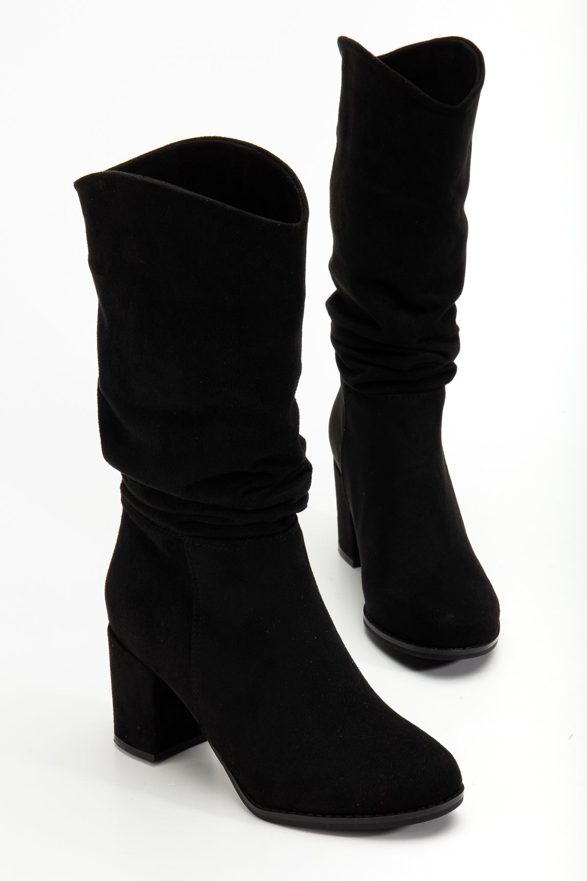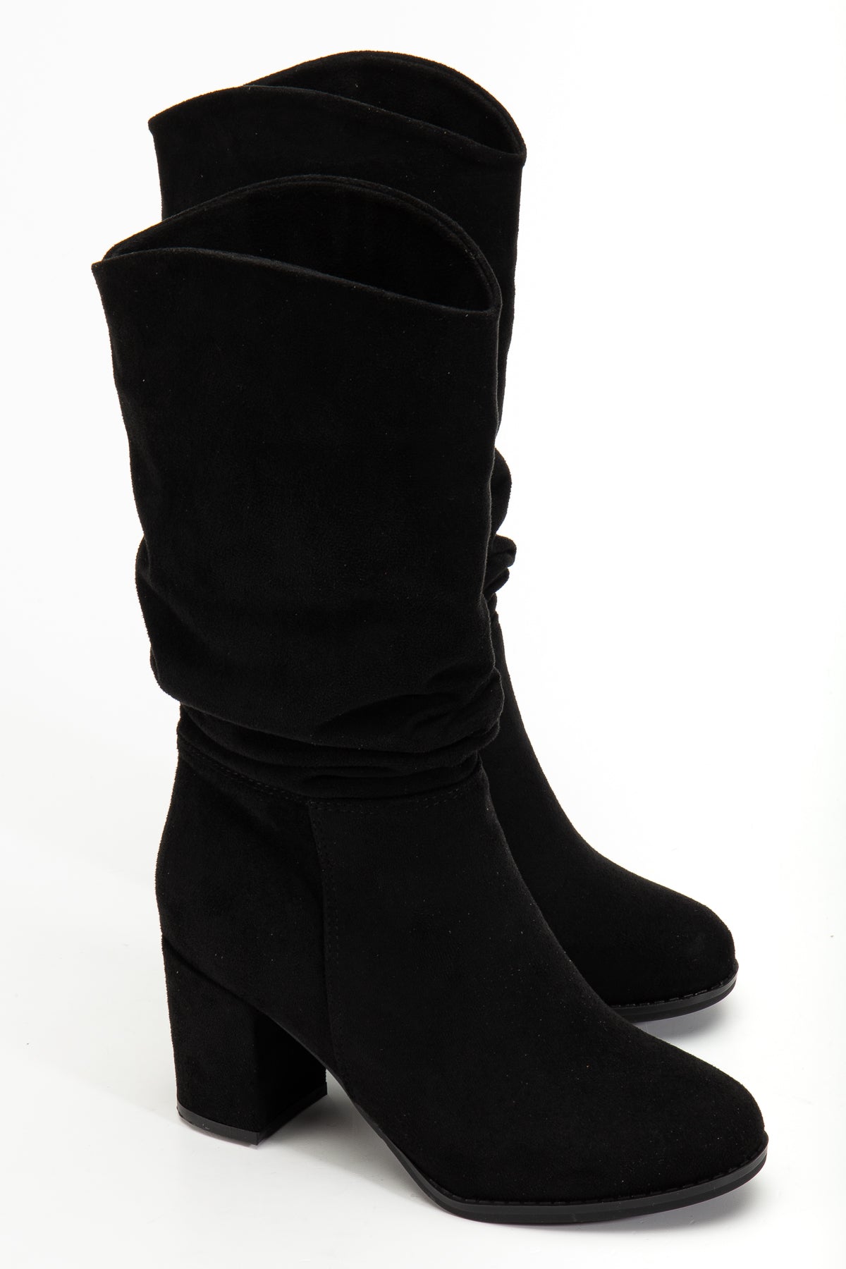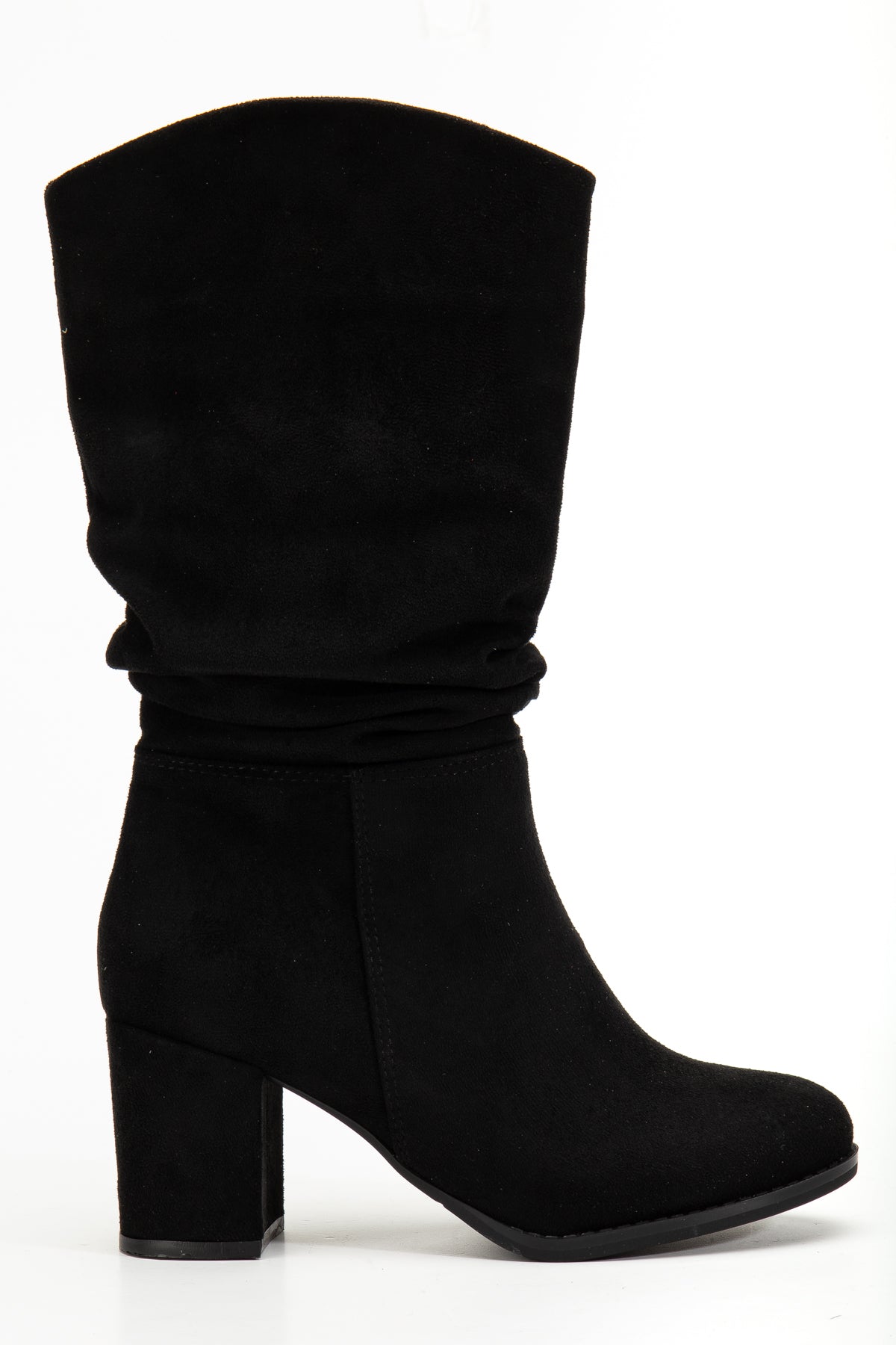 Kadın Kalın Topuk Yuvarlak Burun Büzgülü Diz Altı Çizme Tina Siyah Süet
