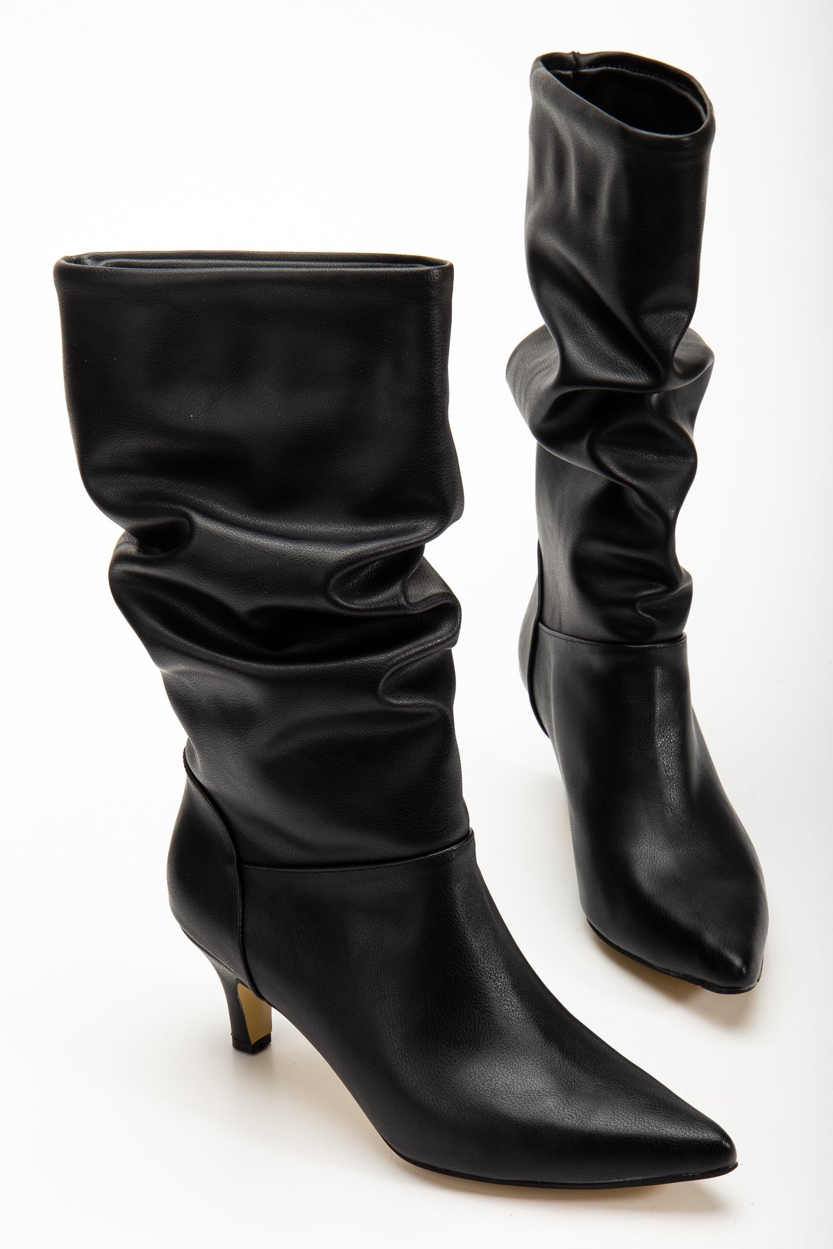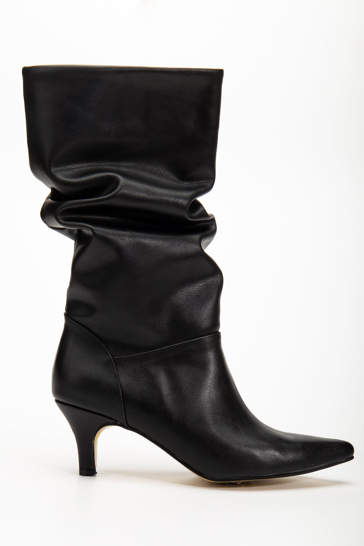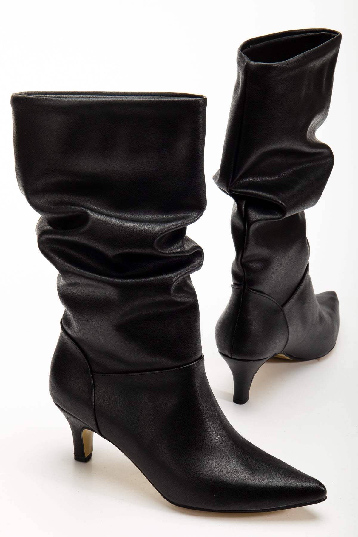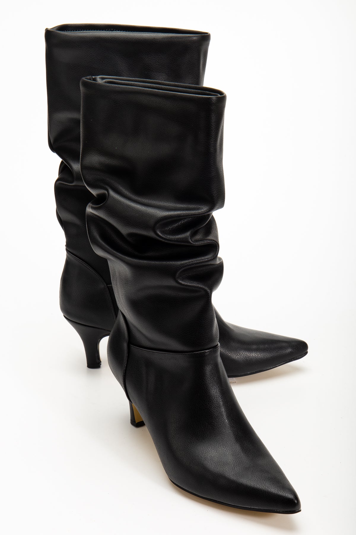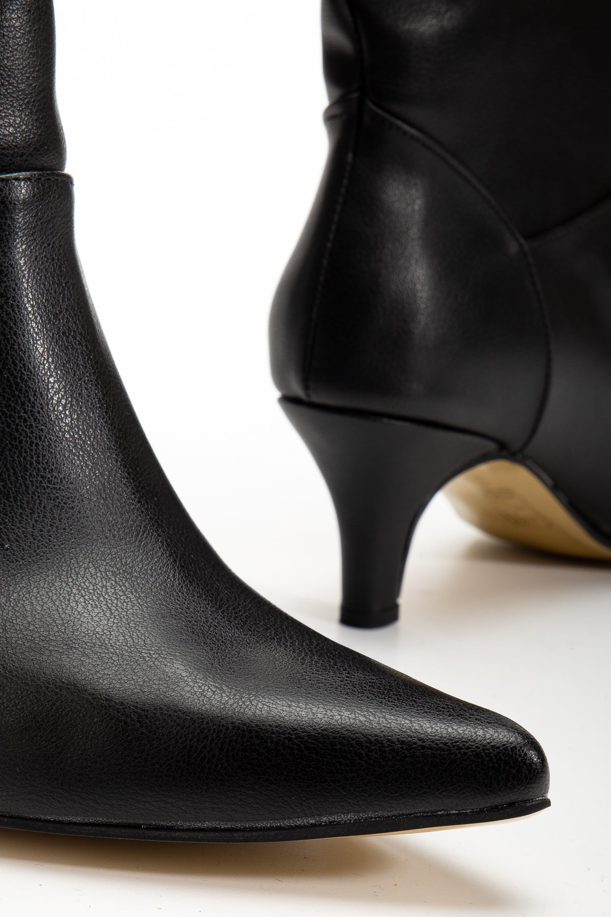 Tores çizme, zarif sivri burun detayı ve körüklü diz altı tasarımıyla klasik ve modern çizgiyi buluşturur. İnce topuğu, zarif bir görünüm kazandırırken günlük kullanıma uygun yüksekliğiyle konforlu bir duruş sunar.