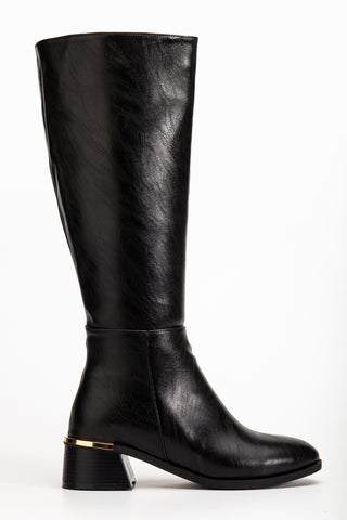 Kadın Diz Altı Altın Toka Detaylı Fermuarlı Günlük Çizme Lina Siyah Rugan