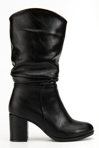 Kadın Kalın Topuk Yuvarlak Burun Büzgülü Diz Altı Çizme Tina Siyah Cilt