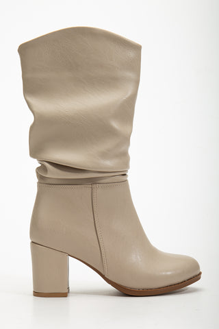Kadın Kalın Topuk Yuvarlak Burun Büzgülü Diz Altı Çizme Tina Beyaz Cilt