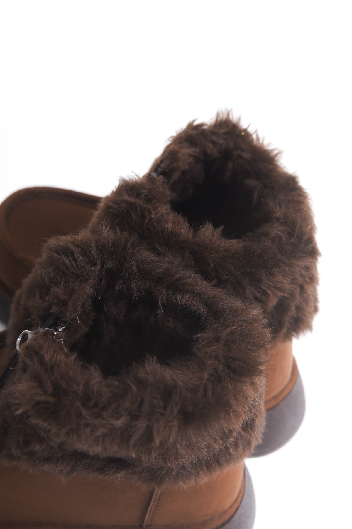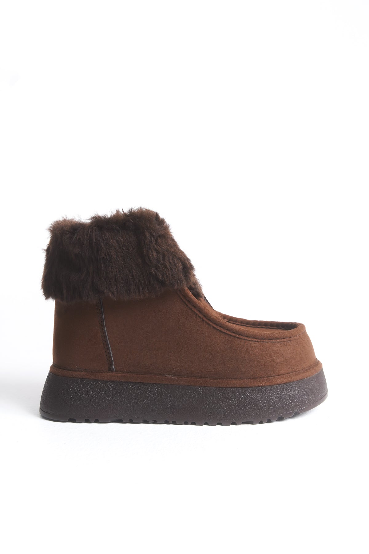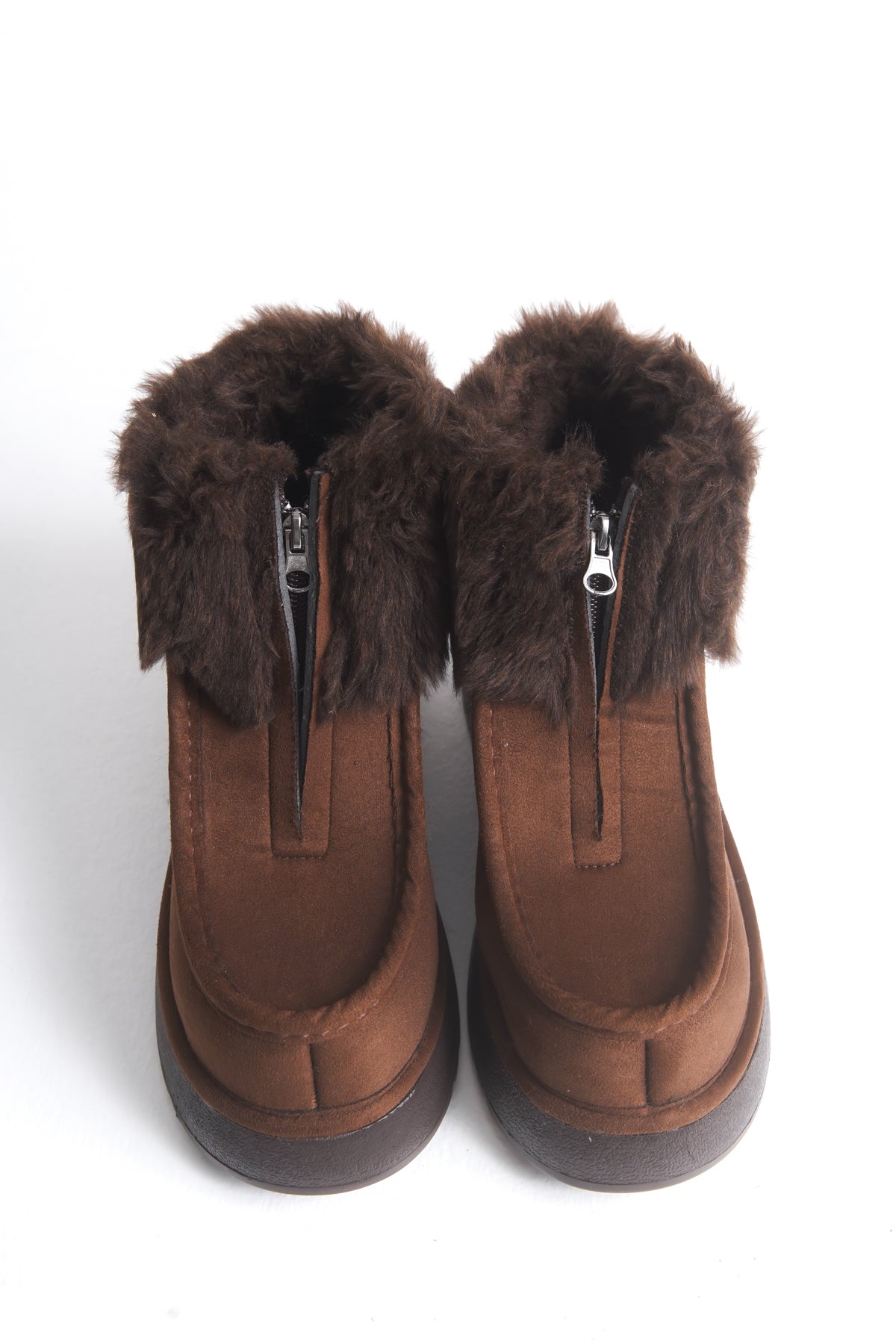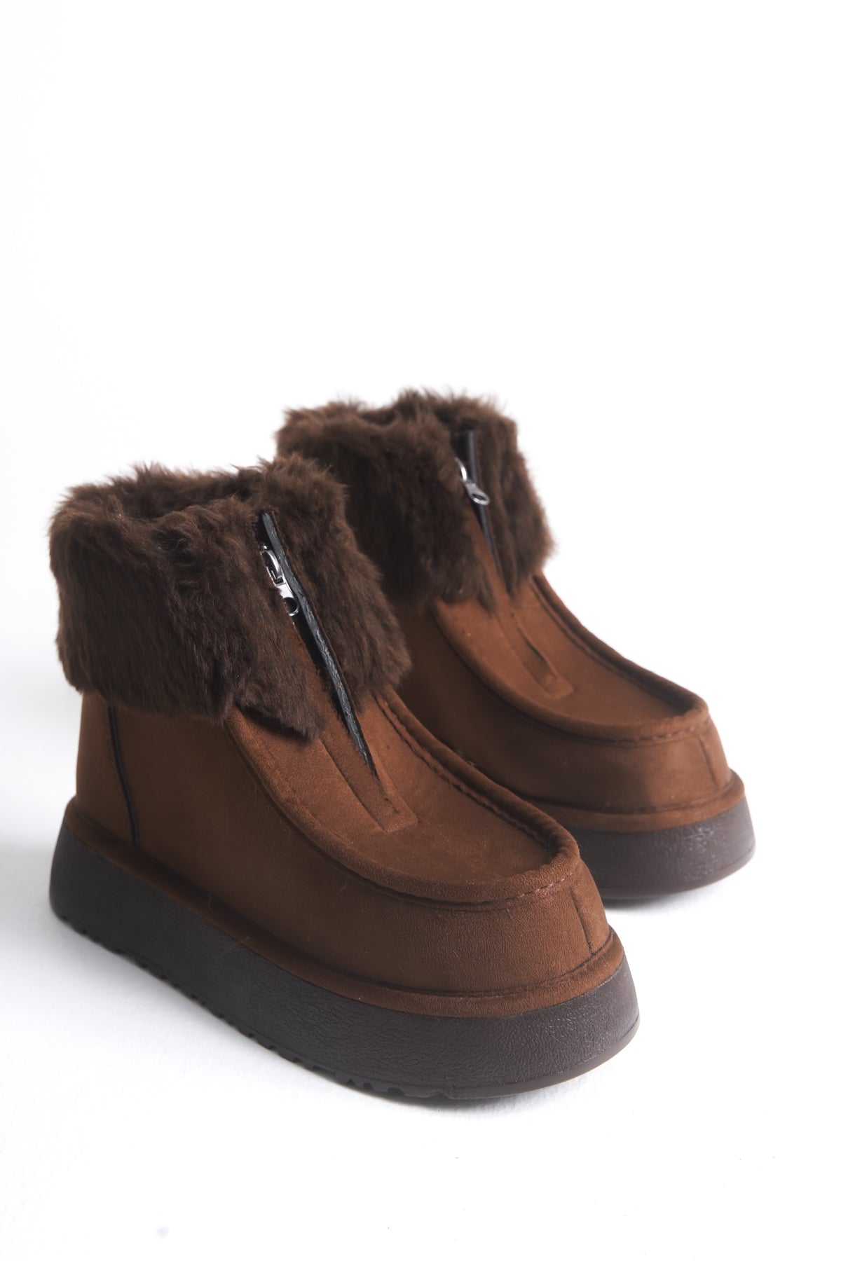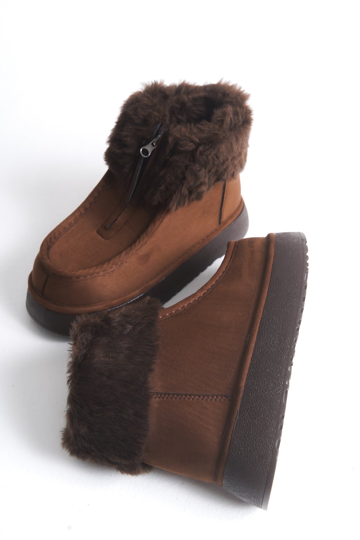 Kadın Kürklü Kalın Taban Önden Fermuarlı Günlük Bot Cara Kahve Süet