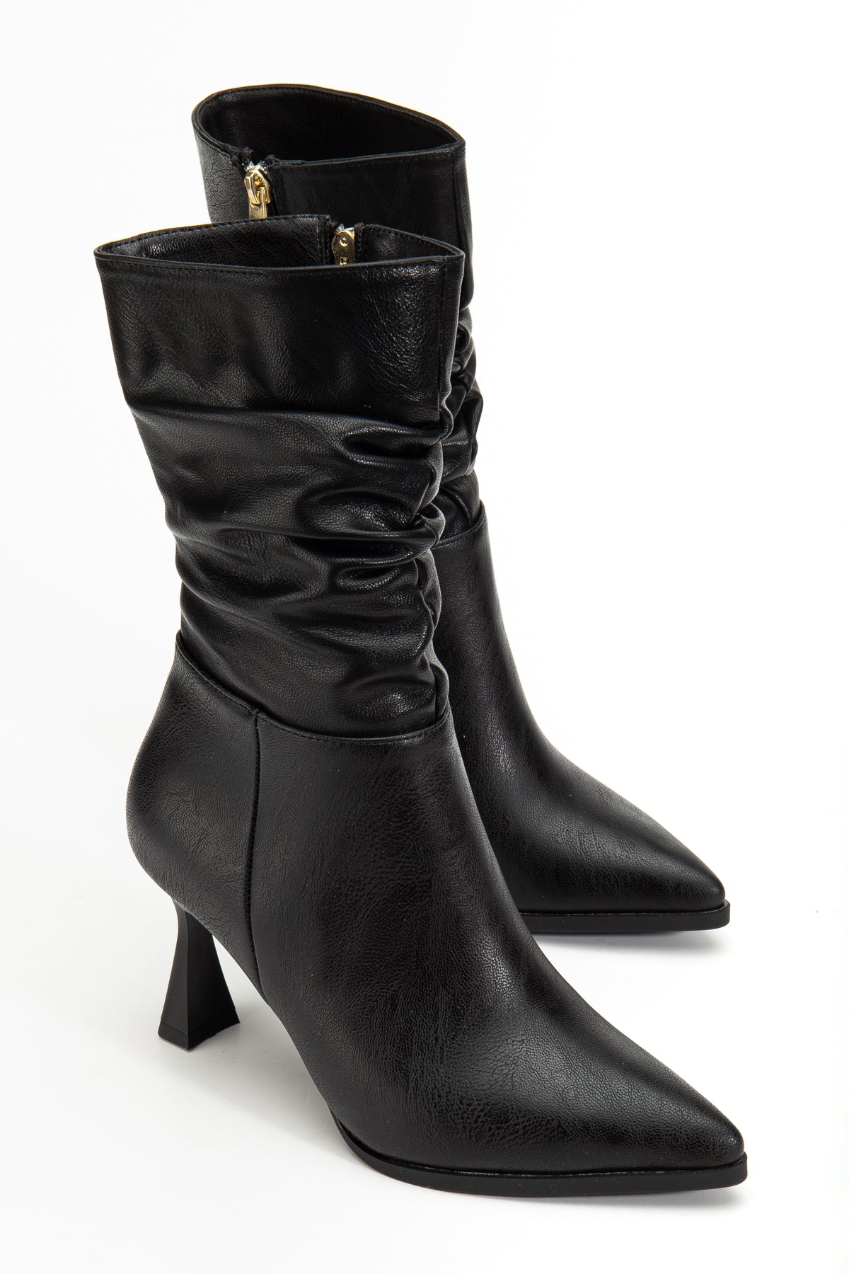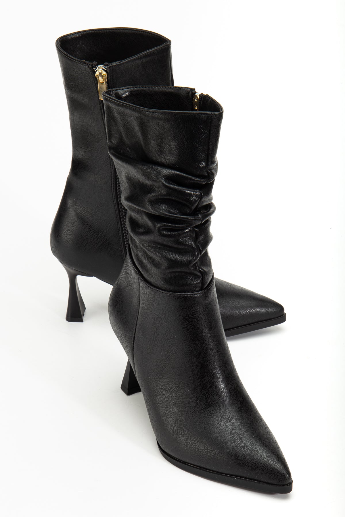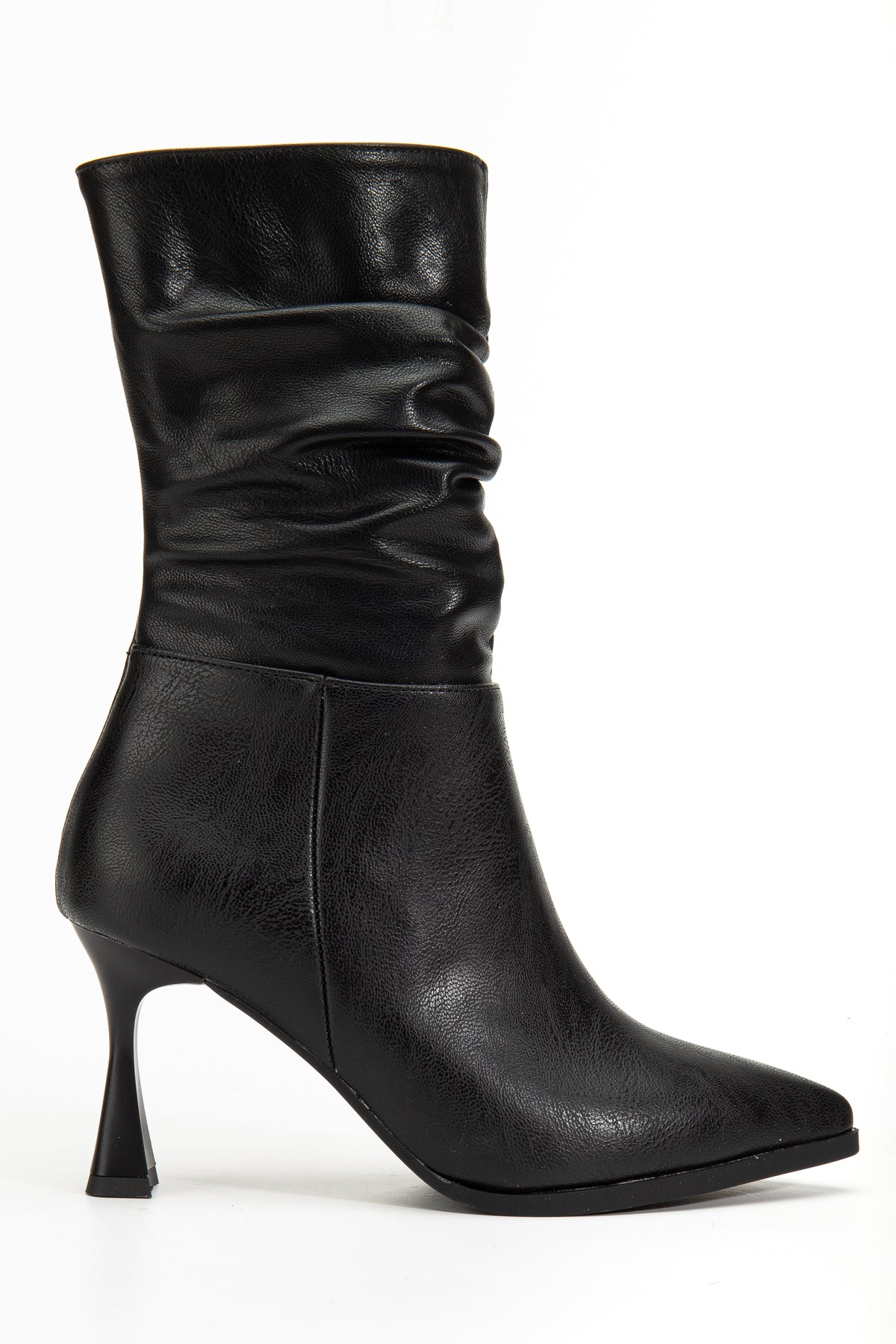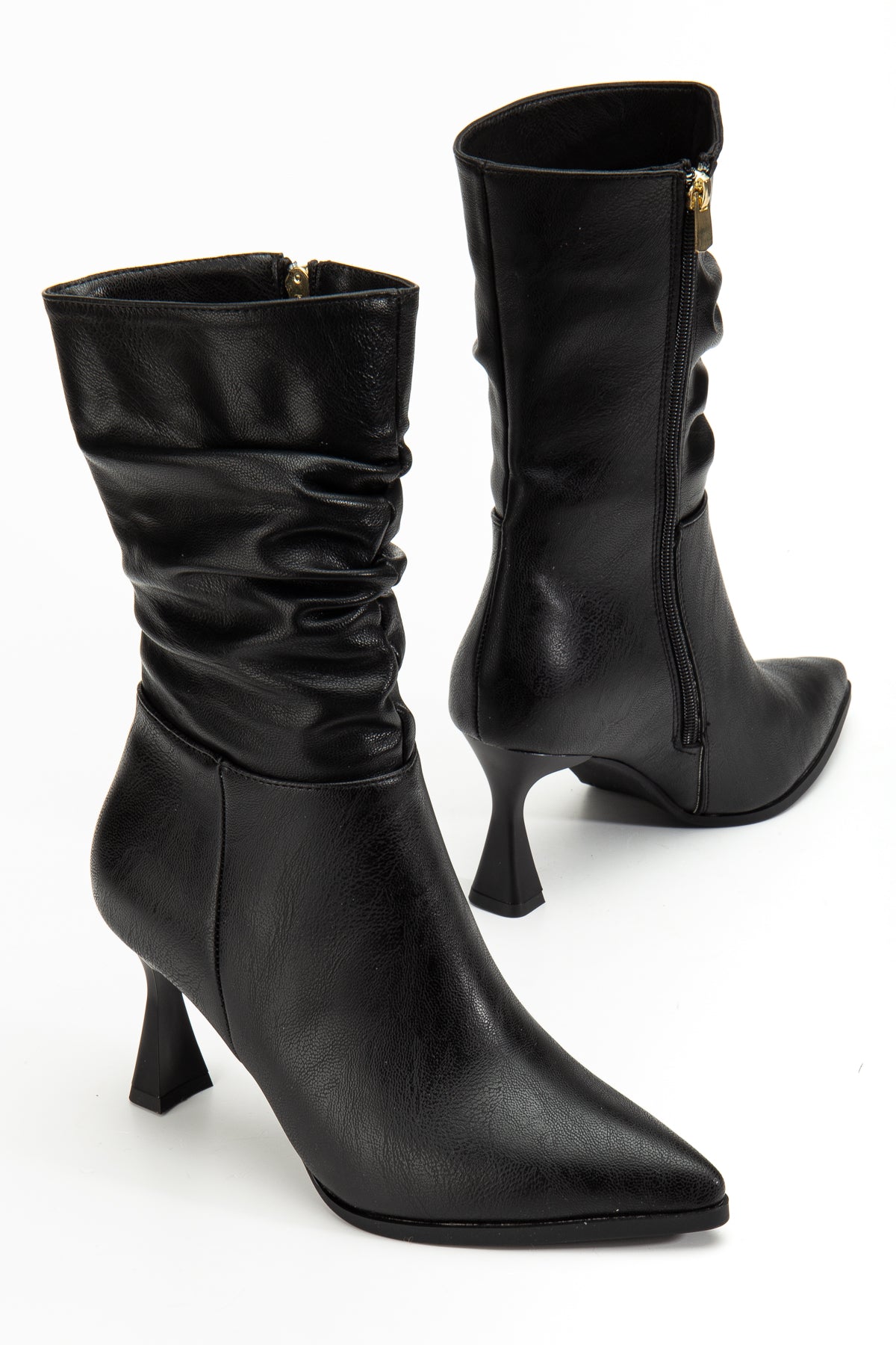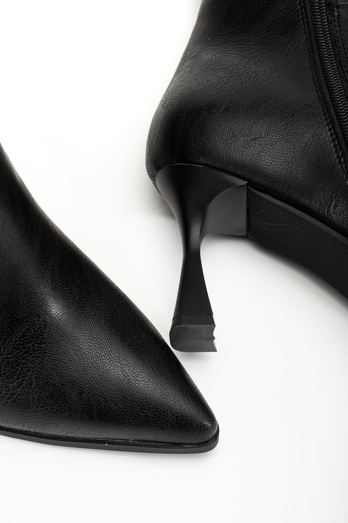 Kadın Topuklu Sivri Burun Körüklü Fermuarlı Kadeh Ökçe Bot Levi Siyah Cilt