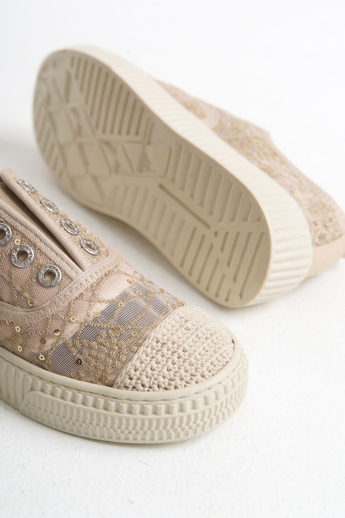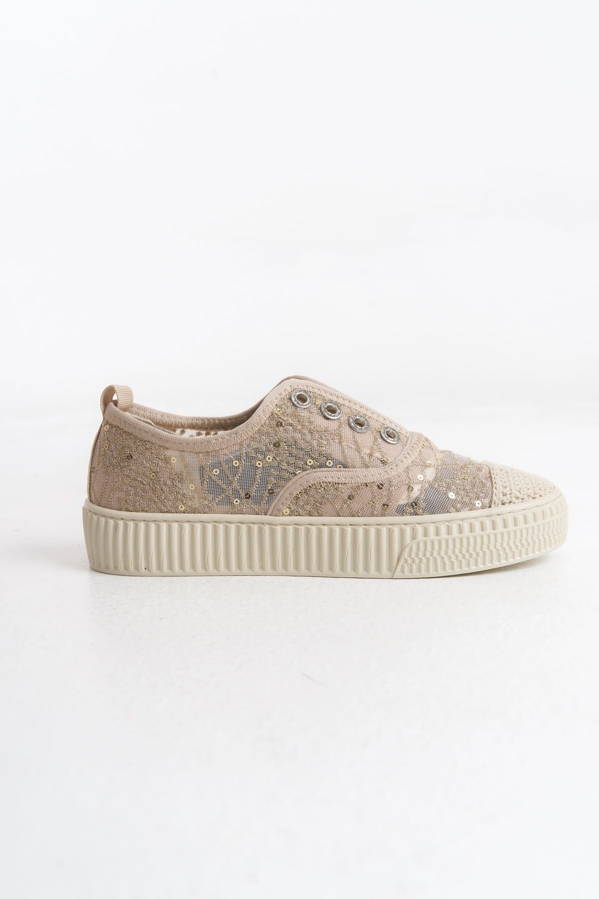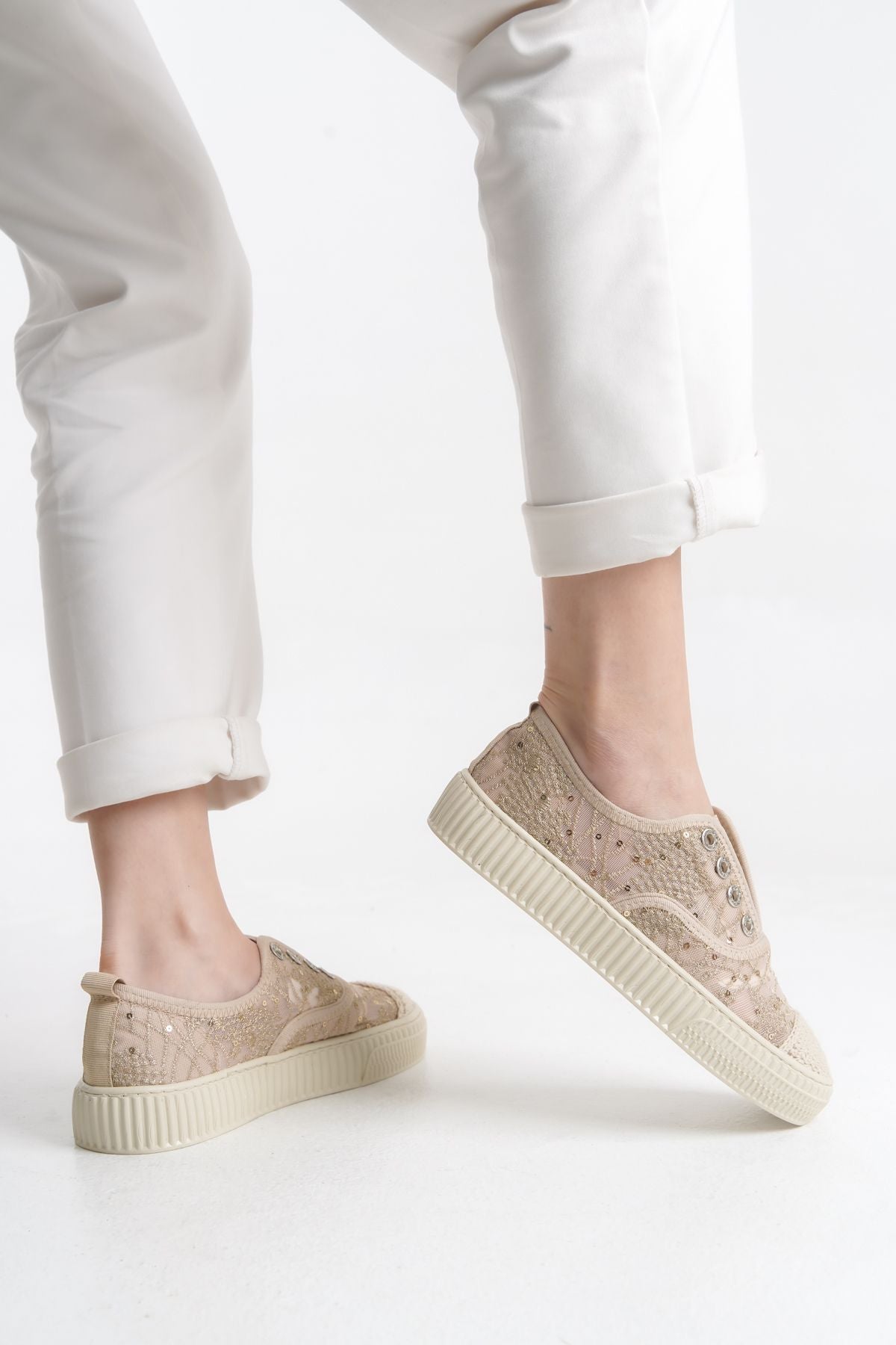 Romantik ve zarif dantel detayları, file dokusu ile birleşerek hem estetik hem de hava alabilen bir yapı sunar. Bu sayede ayaklarınız uzun süreli kullanımlarda bile ferah kalır.