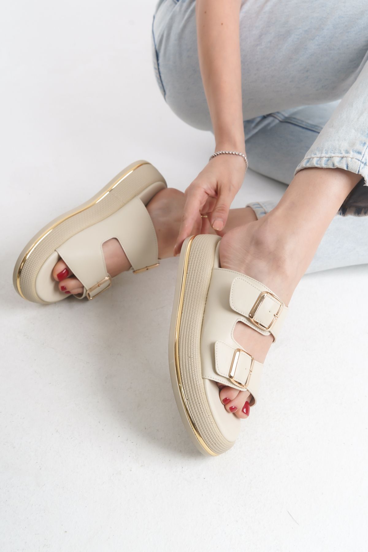 Minimalist ve şık tasarımı sayesinde şehir hayatından tatil kombinlerine kadar her ortamdakolayca kullanılabilir. Ayağı sıkmayan geniş kalıbı, yumuşak iç tabanı ve kaymaz poli tabanıile konforlu ve güvenli adımlar atabilirsiniz.