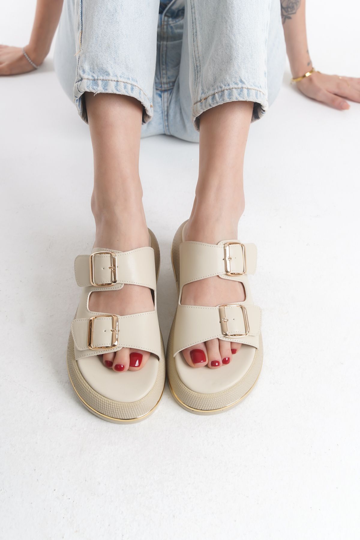 MARSEDO Kadın Günlük Çift Bantlı Tokalı Poli Hafif Taban Terlik Leila