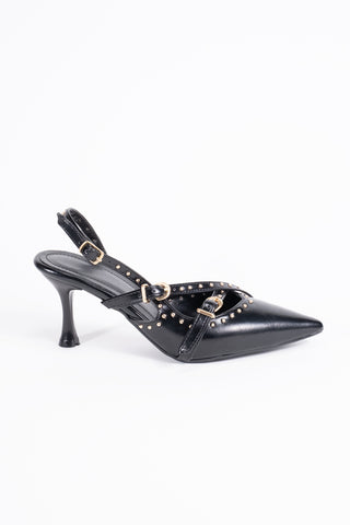 Kadın Stiletto Sivri Burun Arkası Açık Zımba Detaylı Topuklu Ayakkabı Mary Siyah