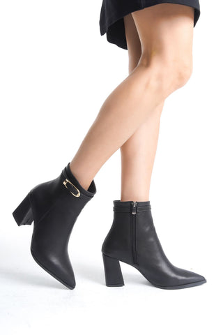 Kadın Yandan Fermuarlı Toka Detaylı Kalın Topuklu Sivri Burunlu Günlük Bot Jura Siyah