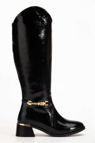 Kadın Diz Altı Altın Toka Detaylı Fermuarlı Günlük Çizme Lina Siyah Rugan